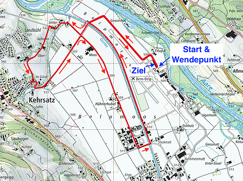 Der Rundkurs ist für alle Kategorien (U19 bis zu Profis, m/f, Paracyclists) gleich und wird bis zu drei Mal befahren: Start/Ziel beim (schlafenden) Flughafen-Hotel, dann zum Schulhaus Selhofen-Kehrsatz hoch, den Fussweg hinüber zu Blumen Maurer, zurück ins Mösli, an der Hühnerhubel-Industrie vorbei zur Gürbebrücke, am Segelflug-Hangar vorbei um den Flughafen zurück ins Ziel (bzw. Wendepunkt) beim Flughafenhotel.