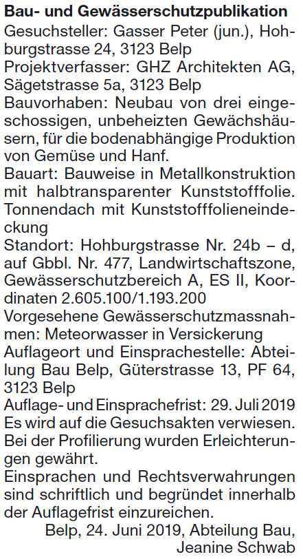 Baupublikation: Neubau Gewächshäuser für Gemüse und HanfTom Mayer | 24. Juni 2019Standort: Hohburgstrasse 24Ähnliche Themen:Mühlematt: Der Gemeinderat muss einmal mehr über die BücherMühlematt: Pro Neubau oder Pro Altbau?Mühlematt-Projekt: Wird der «Fil Rouge» zur Roten Linie von Belp?Ortsplanung-Light: «Kein nennenswertes Wachstumsziel mehr für Belp»«Die Steuererhöhung ist nicht nur durch den Schulhausneubau bedingt»Aus den Rohrleitungen ans Tageslicht