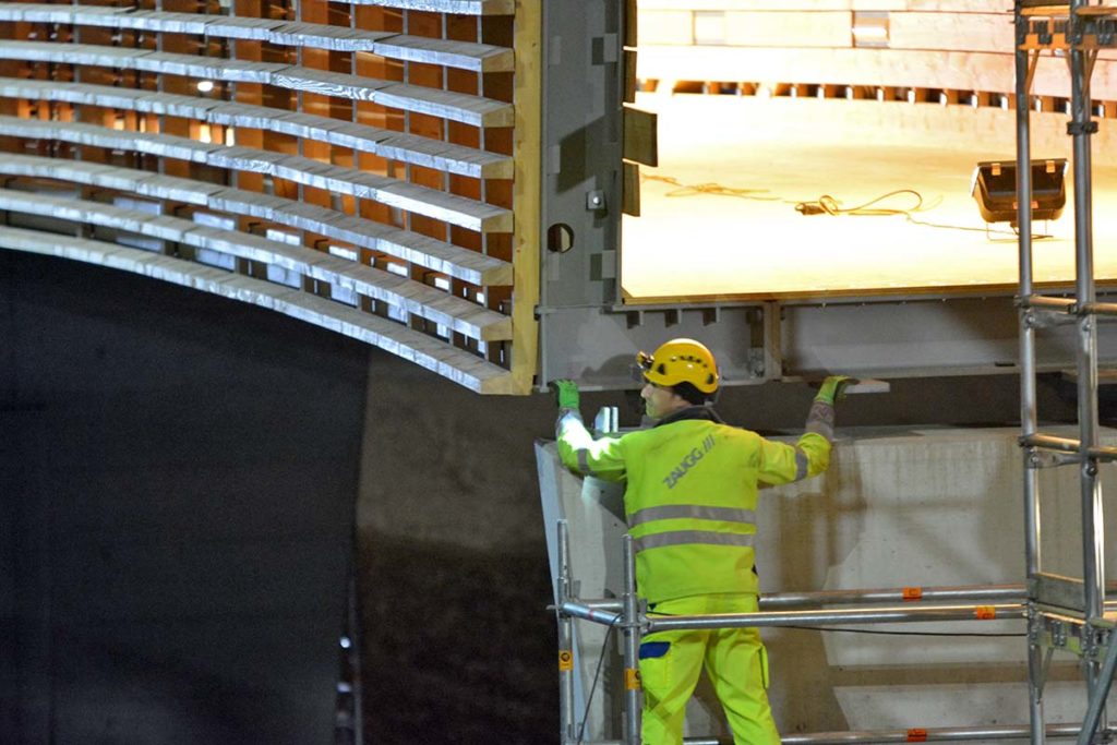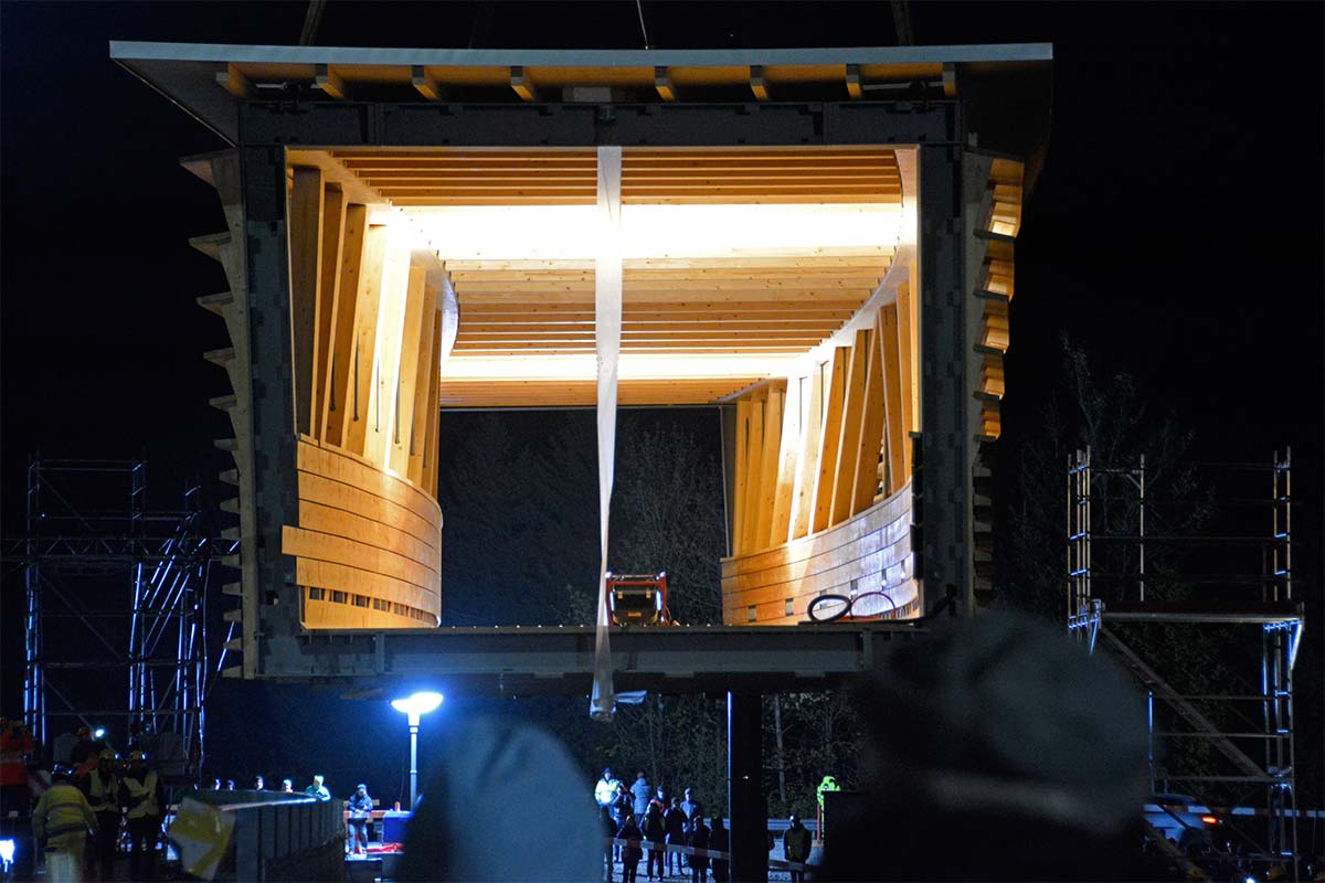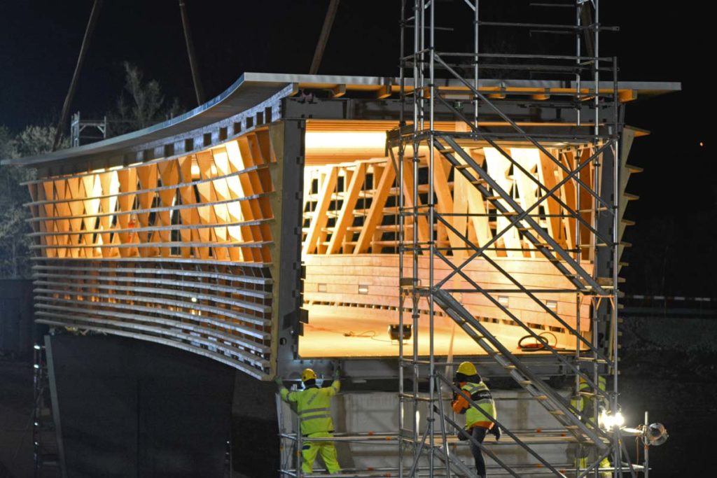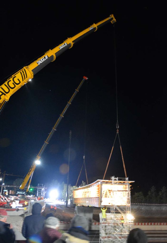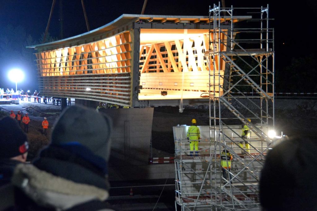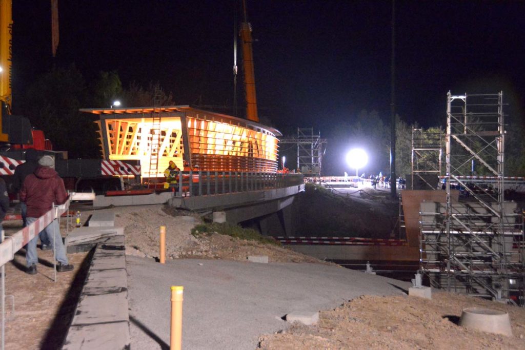 Wer nicht beteiligt ist, wartet geduldig jeden Arbeitsschritt ab. Plötzlich gehts dann richtig los. Fast unmerklich und leise. Brücke weiter anheben, beide Krane drehen sich langsam, keine Motoren heulen auf, die Brücke schwebt sanft gegen die Betonsäulen, dort warten die Monteure, die Brücke touchiert ein wenig das Baugerüst was aber niemanden stört, langsam senkt sich die von Innen leuchtende Stahl-Holz-Konstruktion (Stromgeneratörli…) auf die Brückenköpfe. Sieht so einfach aus, wie Lego.