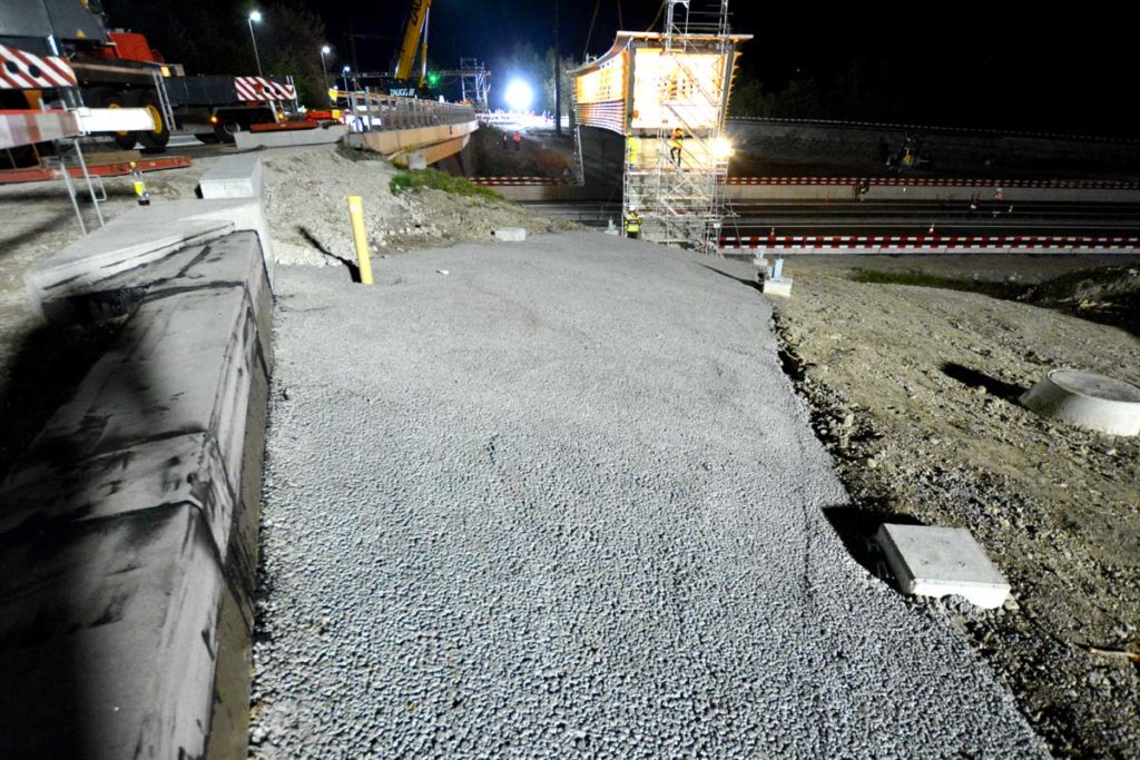 Nur etwa 15 Minuten dauerts, das Heben und Senken über die Autobahn beim Anschluss Belp/Rubigen – schon steht eine neue Brücke in der Landschaft.