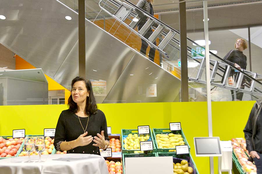Bei einem kurzen Rundgang bestätigt sich: Man orientiert sich schnell in der neuen Migros. Farbliche Abtrennungen, klare räumliche Anordnung der Regale und grosse Themenbildern helfen dabei. Einen riesigen Schritt im Vergleich zur alten Migros ist der freiere Raum, das Licht oder die elegante Typografie der Sortiments-Beschriftung.