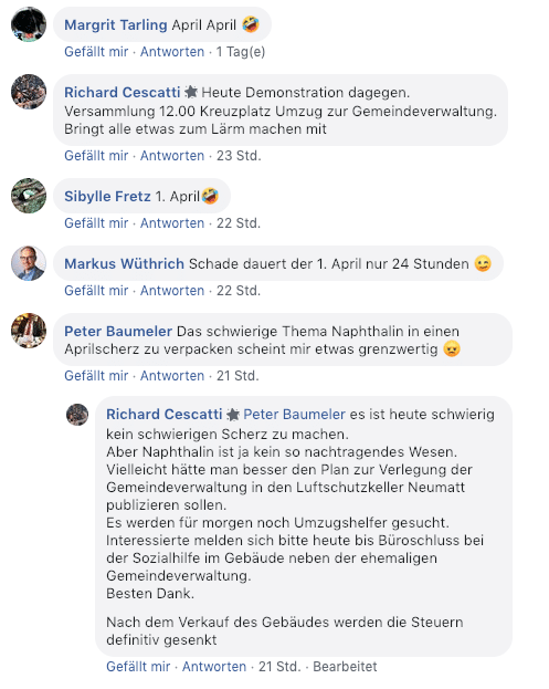 Schöner 2. April allen – mit den Kommentaren der Facebook-Gruppe «Belp – unser Dorf» zum Link «Schule Belpberg: Neubau nötig». Von der lärmenden Demo quer durchs Dorf über schwierige Themen bis zur Gemeindeverwaltung, die in den Luftschutzkeller gezügelt wird, was die Steuern senken würde.