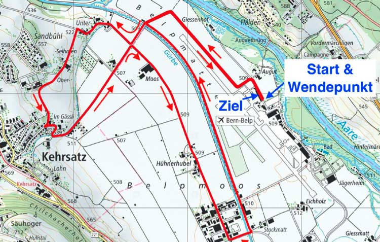 Die Strecke dieser Meisterschaften führt um den nördlichen Flughafen, dann zum Selhofen-Schulhaus hoch, hinüber zu Blumen-Maurer, runter ins Moos, nach dem Hühnerhubel links weg, bei den Segelfliegern vorbei und um die Piste-32 herum wieder zurück zum Flughafen. Je nach Kategorie sind eine, zwei oder drei Runden zu fahren.