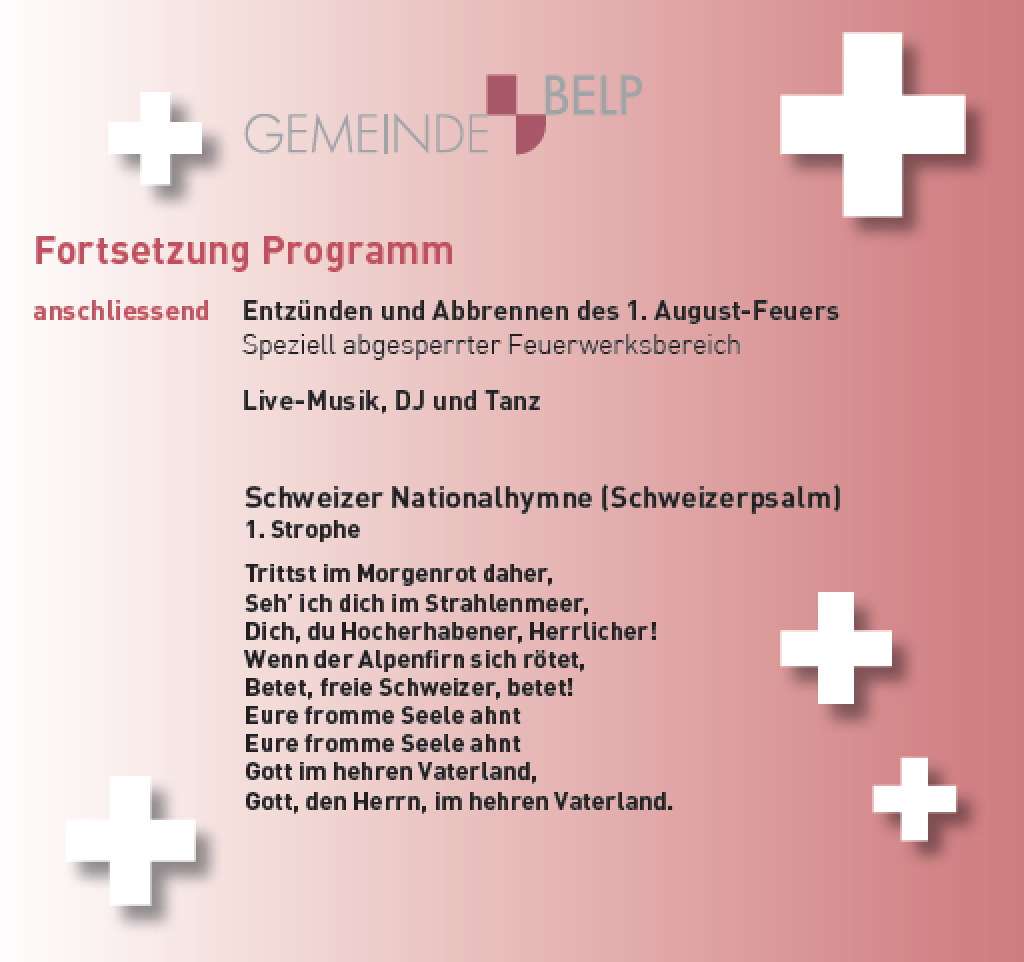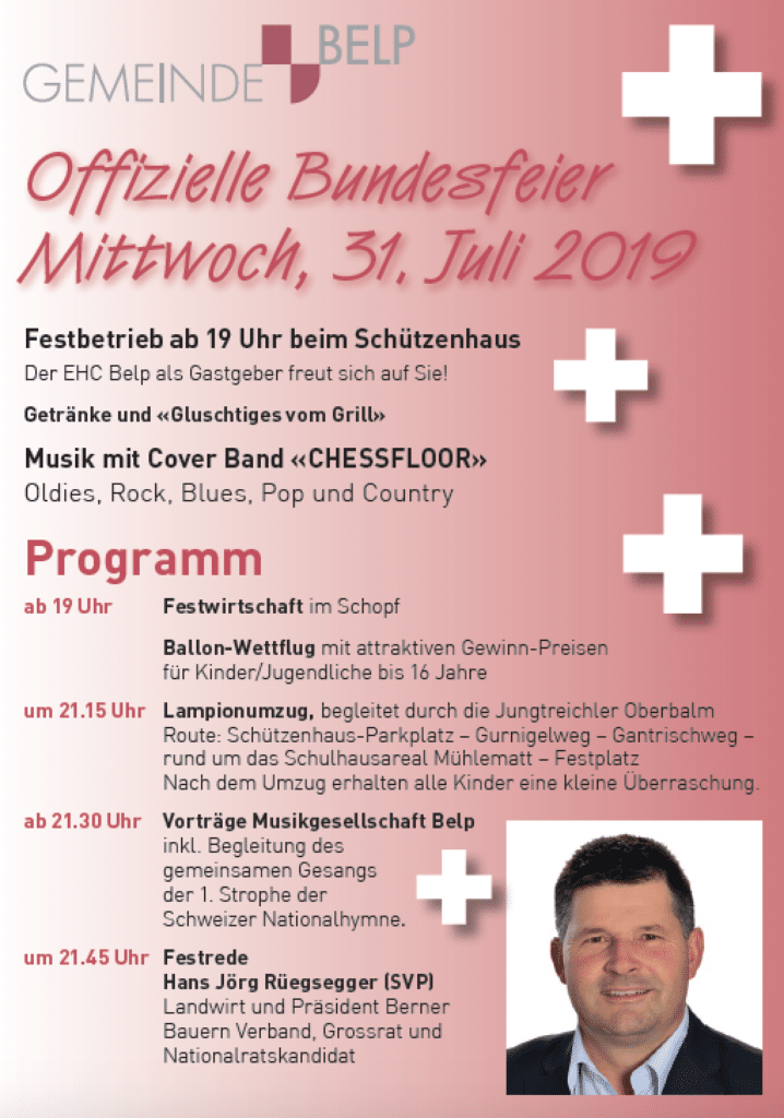 MI 31. Juli 2019, ab 19 Uhr, Schützenhaus Belp.