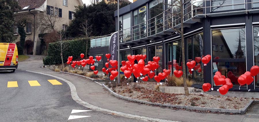 Ein trüber Tag in Sachen Wetter. Dafür ein bunter Tag in Blumenläden und, welch schöner Farbtupfer, beim Apple Shop Belp. Die Zettel an den Herzen sind keine Liebesbriefe, sondern «nur» Gutscheine um ein paar Franken oder Prozente günstiger zu Computer-Sachen zu kommen.