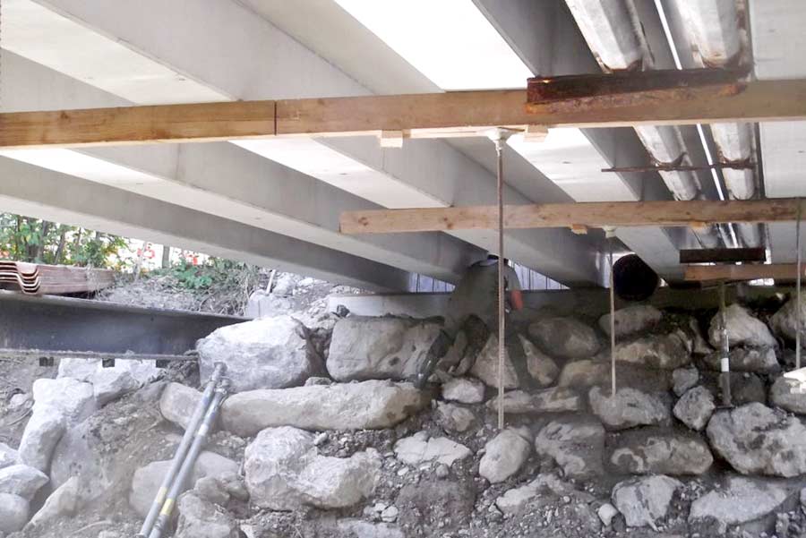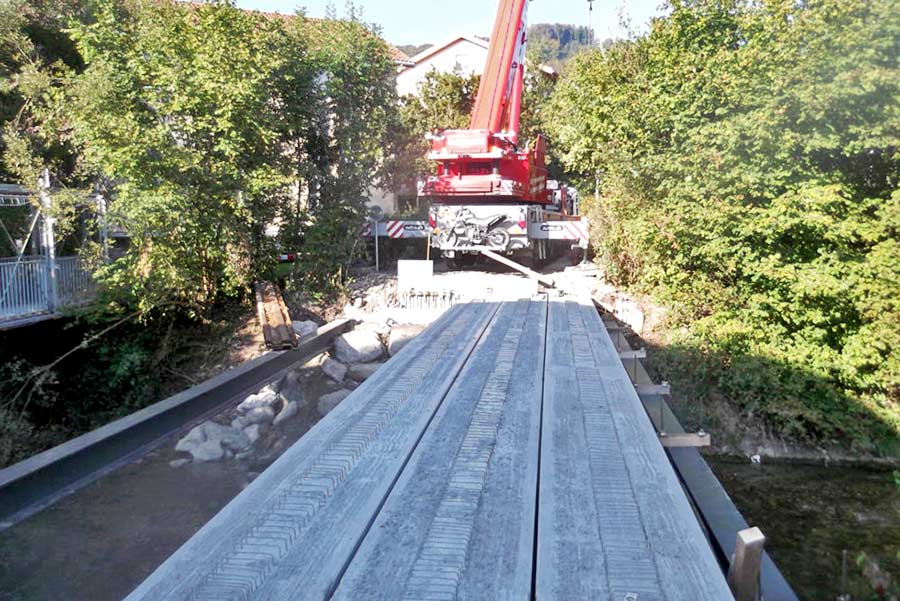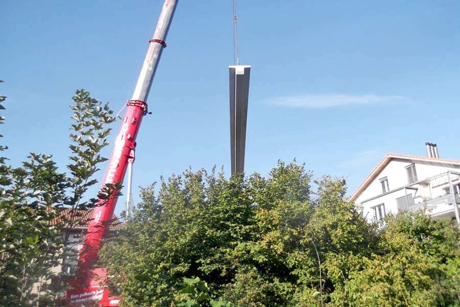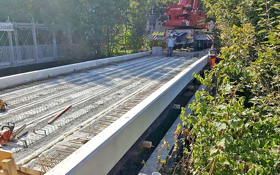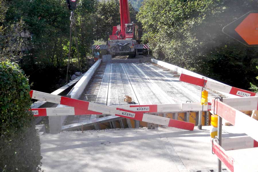 Die Grundkonstruktion der Brücke wurden innerhalb nur 3 Stunden montiert. Mithilfe eines Pneukranes wurden die Elemente passgenau auf die vorher erstellten Lager versetzt. Die Brückenelemente sind aus einer Betonsorte hergestellt, die dem aggressiven Frosttausalz besonders gut widersteht.